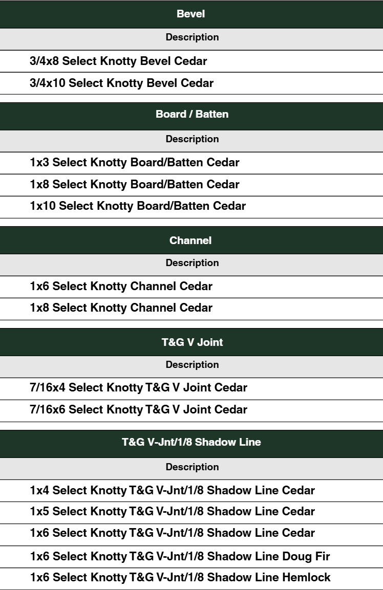 All siding products are available in STK, Clear, and Custom grades. Surfacing options include S1S2E, S4S, or rough-cut finishes to match your specifications.